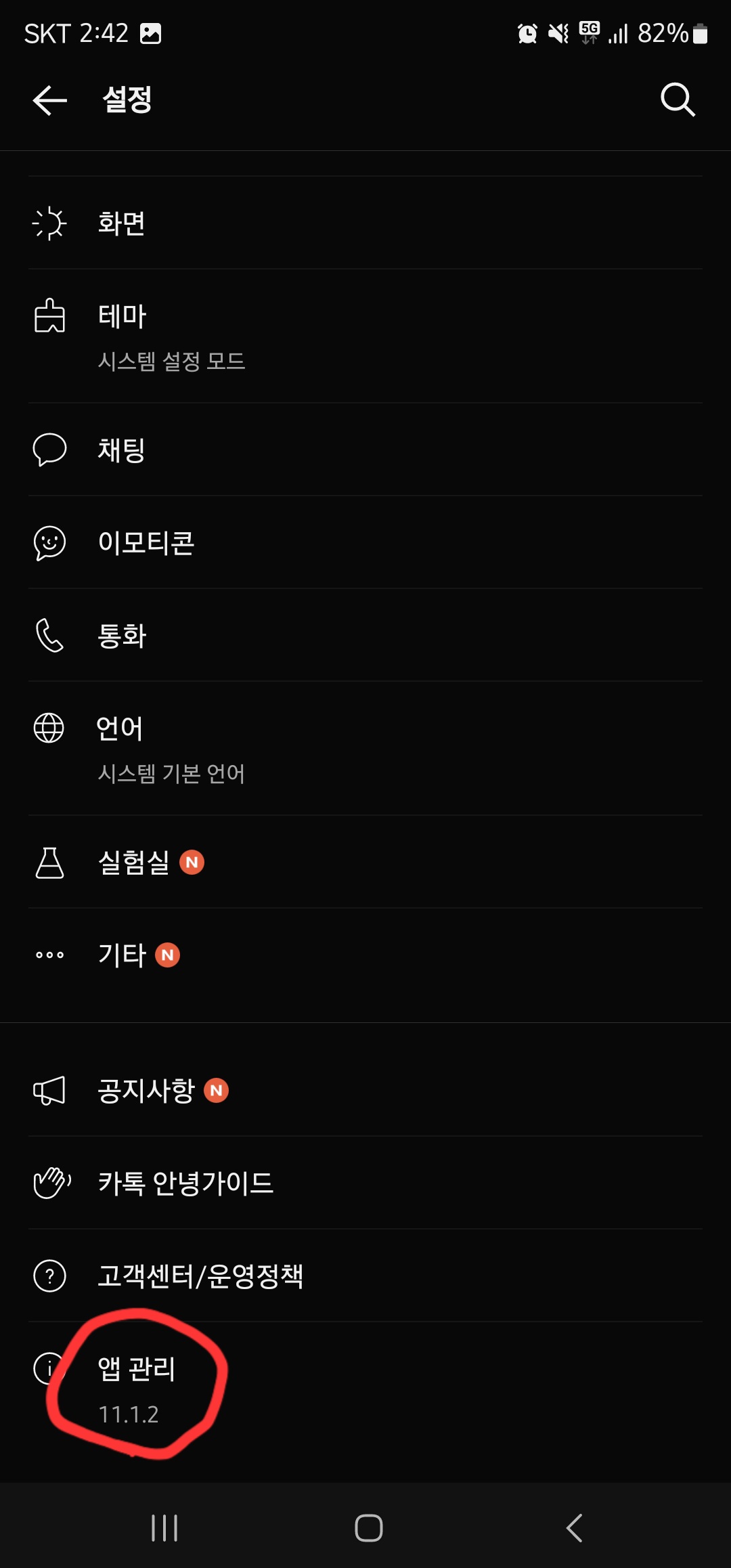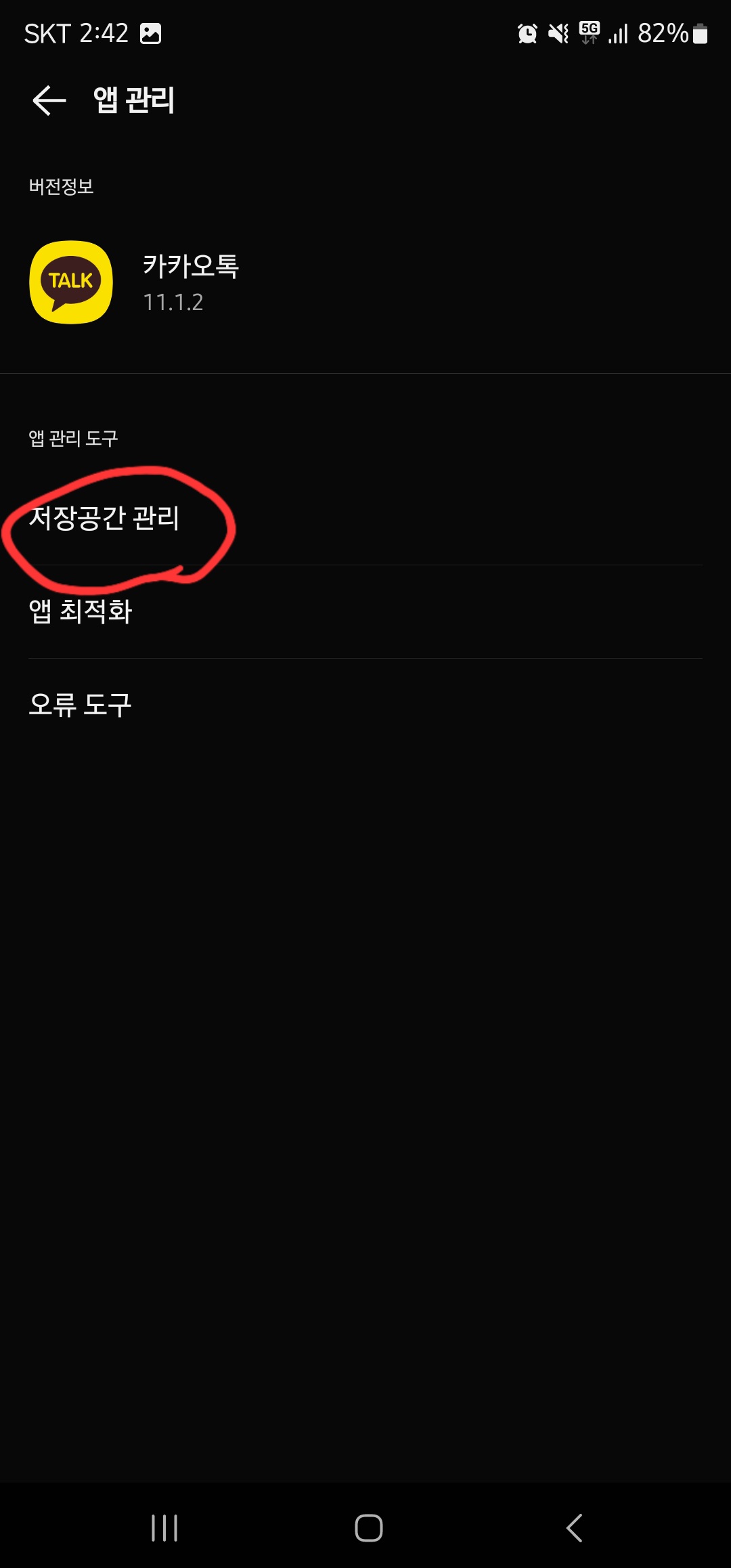카카오톡 설정창에 진입하셨으면, 가장 아래로 스크롤하여 “앱관리” > “저장공간 관리”를 클릭하여 줍니다.