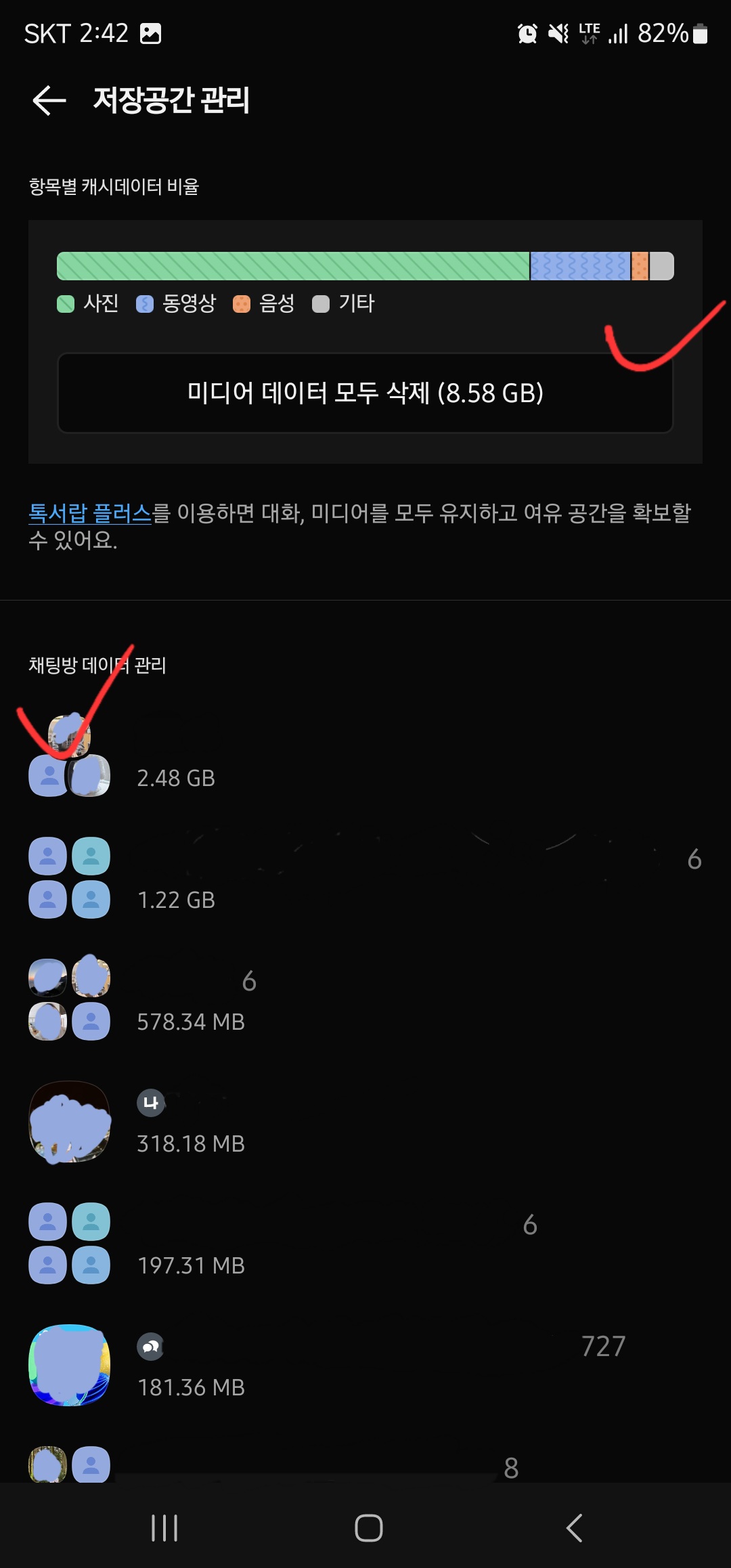 여기에서 대화 기록을 제외한 모든 대화방의 사진, 동영상, 파일 등을 삭제하고 싶으시다면 상단의 “미디어 데이터 모두 삭제”를 클릭하시면 됩니다.