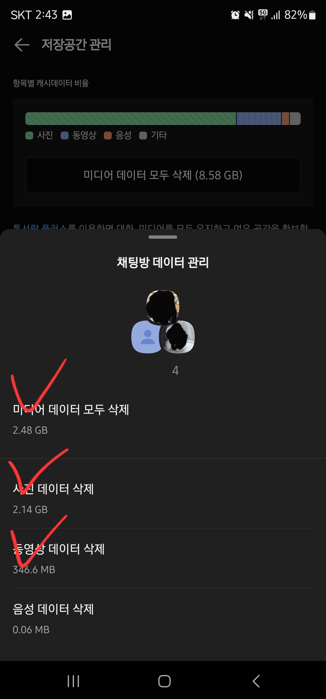 만약 전체 삭제를 원치 않고, 특정 대화방의 데이터만 삭제를 하고 싶으신 경우에는 데이터 삭제를 원하는 대화방을 찾아 클릭하신 후 원하시는 데이터를 선택하여 삭제하시면 되겠습니다.