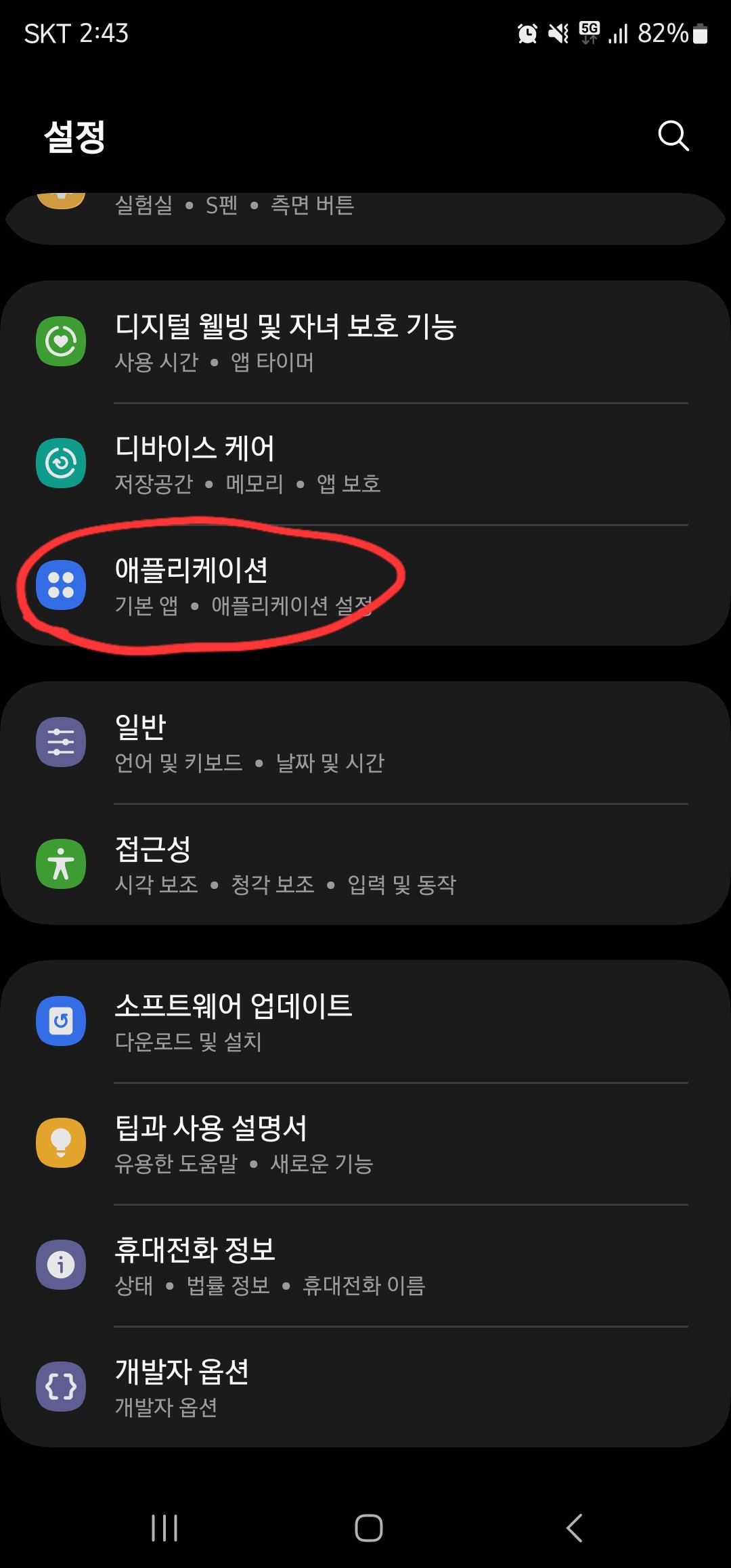 스마트폰의 설정에 들어가 아래로 스크롤 후 “애플리케이션”항목을 찾아 클릭합니다.
