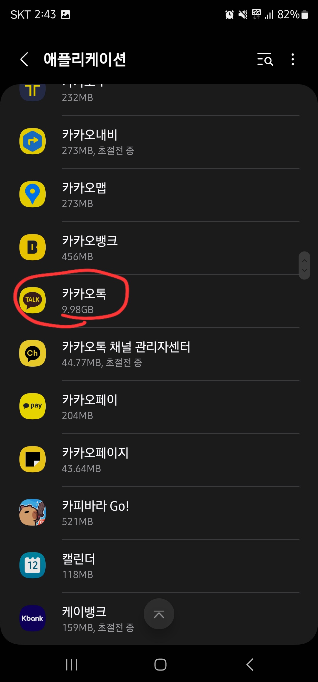 이후 아래로 스크롤하면서 카카오톡 앱을 찾아 클릭합니다.