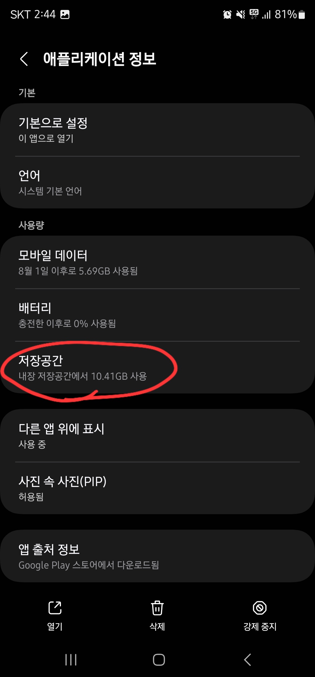 카카오톡 앱 정보에 진입하셨으면 “저장공간”항목을 찾아 클릭합니다.