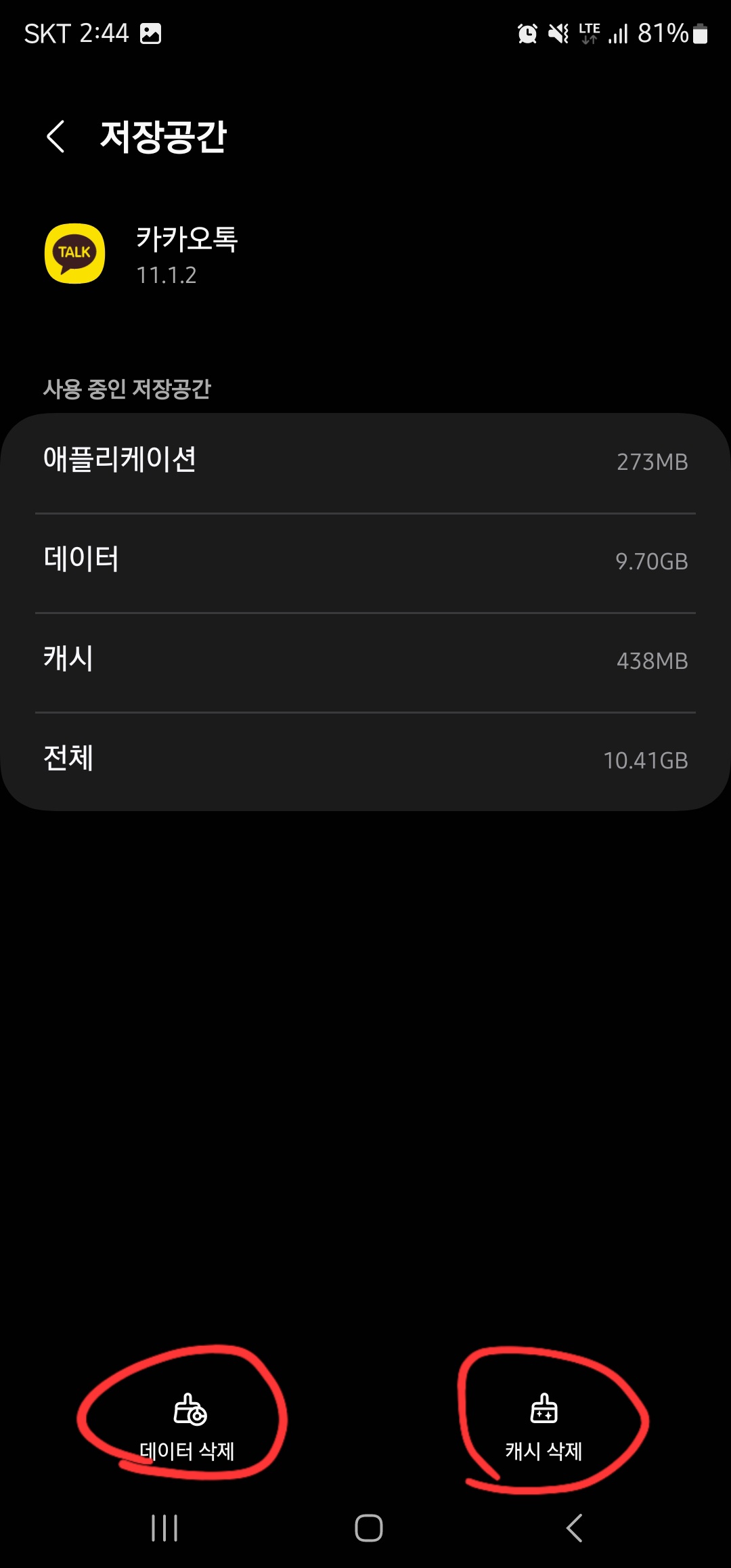 2. 카카오톡 데이터 및 캐시 삭제