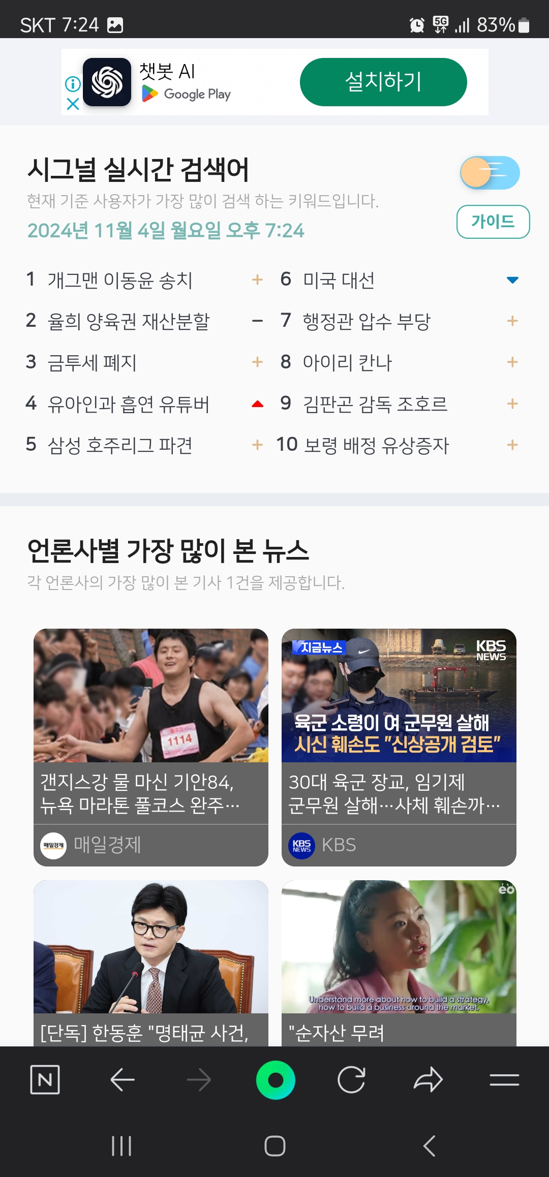 1. 네이버 앱 실행 및 실시간 검색어 홈페이지 접속